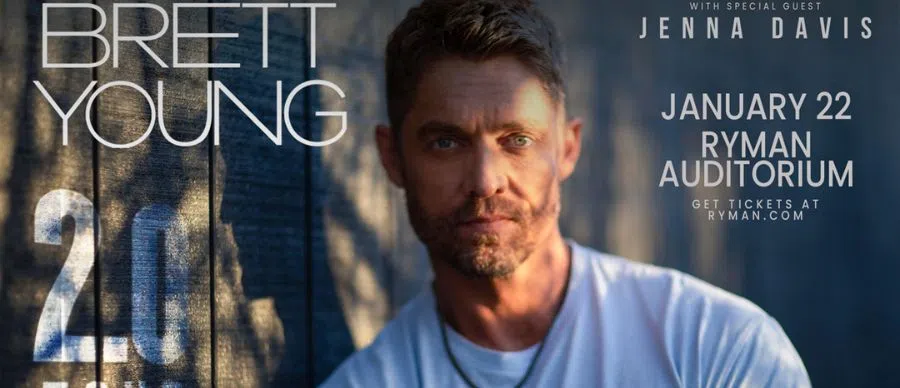 Win your way into a night of country love songs - Brett Young LIVE at the historic Ryman Auditorium, January 22nd on the 20 Tour with special guest Jenna Davis!
