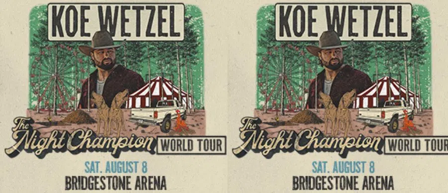 Koe Wetzel is bringing The Night Champion World Tour to Bridgestone Arena on August 8th, and he's rolling in with Shane Smith & The Saints and Bayker Blankenship for a powerhouse night of country-rock. It's shaping up to be one of the biggest shows of the summer - and 95.5 WSM wants to put you in the crowd!
