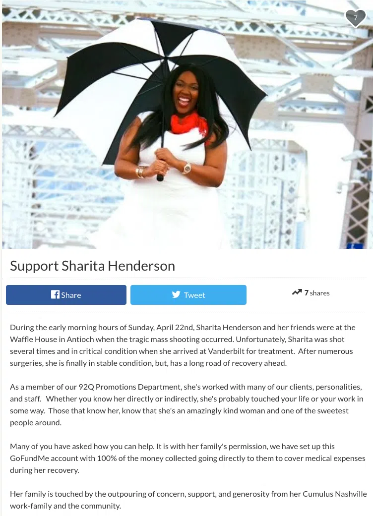 A GoFundMe page has been created for Sharita Henderson, who was shot multiple times at a Waffle House in Antioch, Tenn., on April 22 after a lone gunman opened fire, killing four people and injuring several others.
