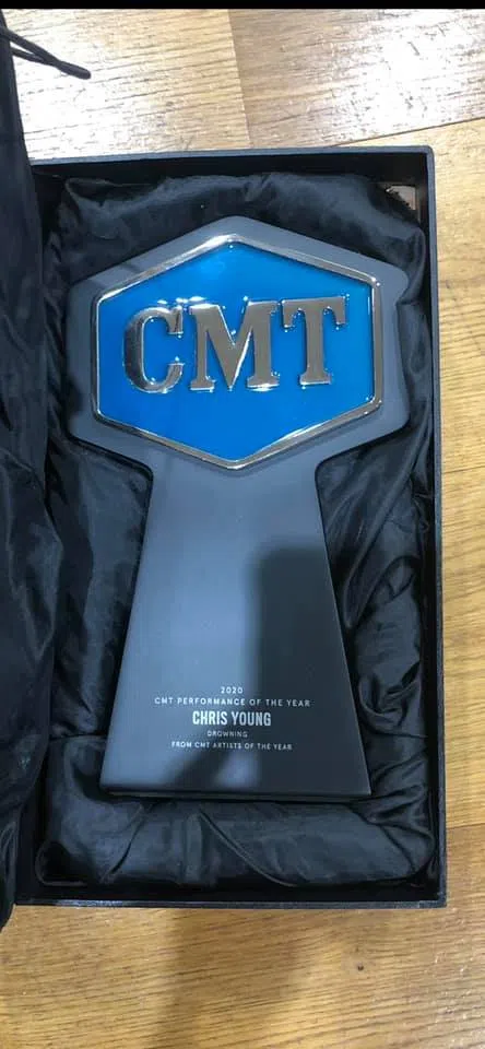 Chris Young shared on social media that his CMT Award for Performance of the Year for “Drowning” arrived.